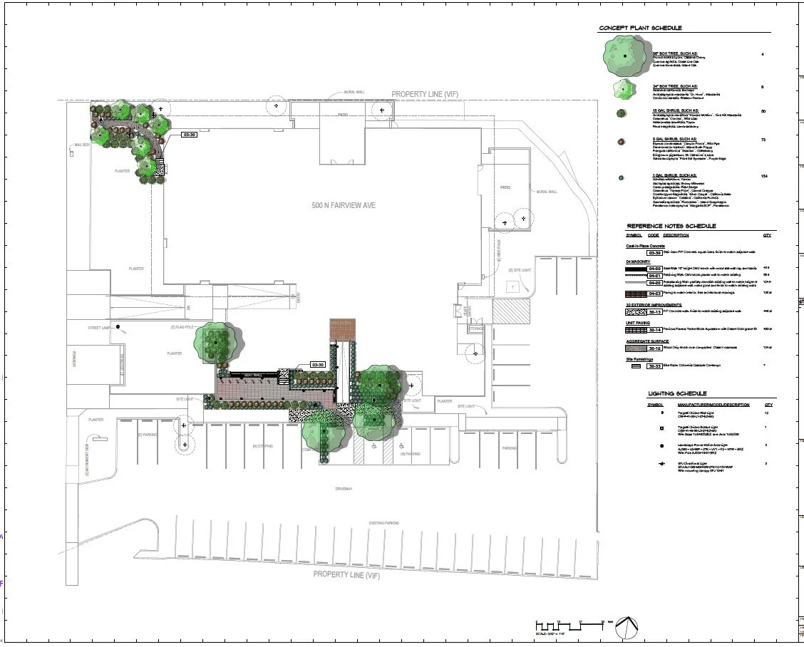 The City was awarded a grant for accessibility upgrades to the interior and exterior of the library. We improved the parking lot, entrance, and street frontage with new paving, bike parking, shade trees, and California-friendly planting.