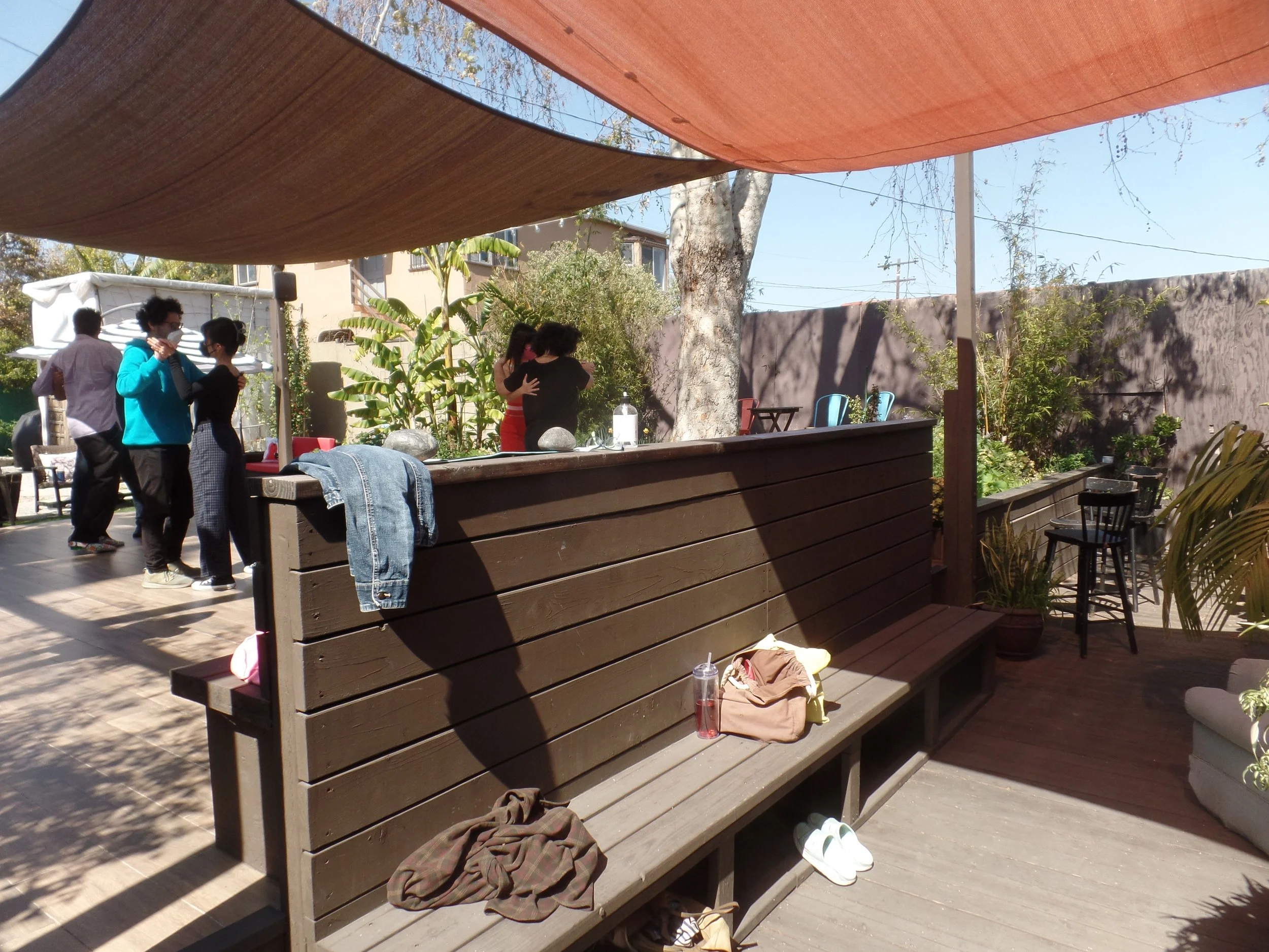 Pressured by the social distancing requirements from the COVID pandemic, this dance studio relocated their dancefloor outdoors with storage cubbies, seat benches, improved slope retaining walls and drainage, a shade sail structure, and a new porcelain tile dancefloor.